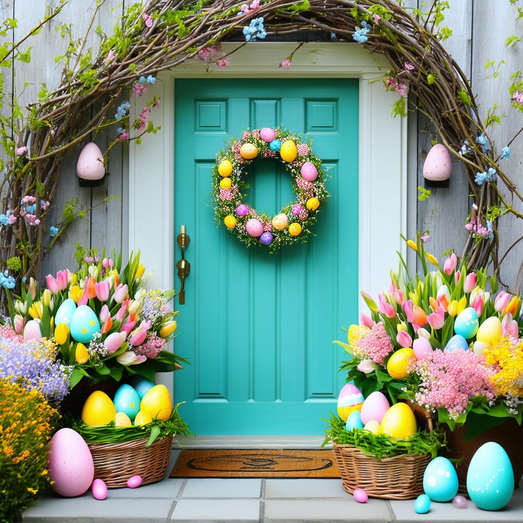 Ozdoby wielkanocne przed wejściem do domu Ozdoby wielkanocne już na samym wejściu do domu tworzą radosny nastrój, przyciągając tym samym